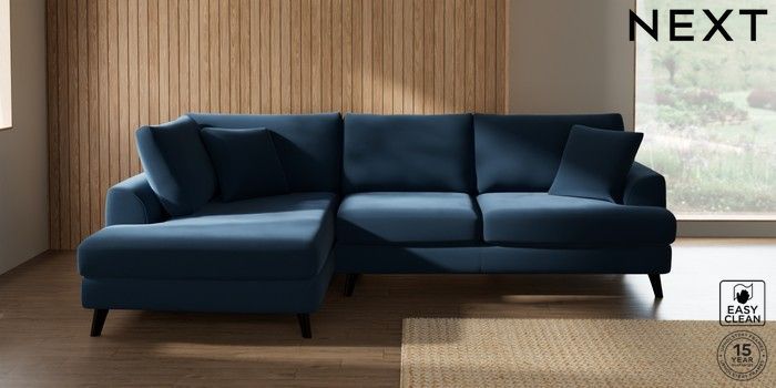 7.3.1 Buy Parker Medium Corner Chaise - Left Hand Plush Velvet Easy Clean Airforce Blue Low Retro Tapered - Dark from the Next UK online shop Click here to use our accessible website