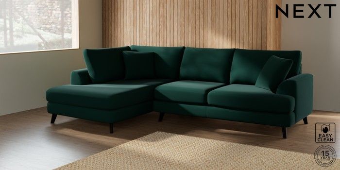 7.2.5 Buy Parker Medium Corner Chaise - Left Hand Plush Velvet Easy Clean Bottle Green Low Retro Tapered - Dark from the Next UK online shop Click here to use our accessible website