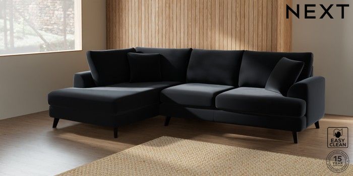 7.2.5 Buy Parker Medium Corner Chaise - Left Hand Plush Velvet Easy Clean Charcoal Grey Low Retro Tapered - Dark from the Next UK online shop Click here to use our accessible website