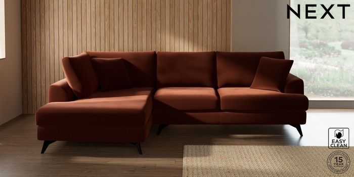 7.3.1 Buy Parker Medium Corner Chaise - Left Hand Plush Velvet Easy Clean Ginger Orange High Metal - Black from the Next UK online shop Click here to use our accessible website