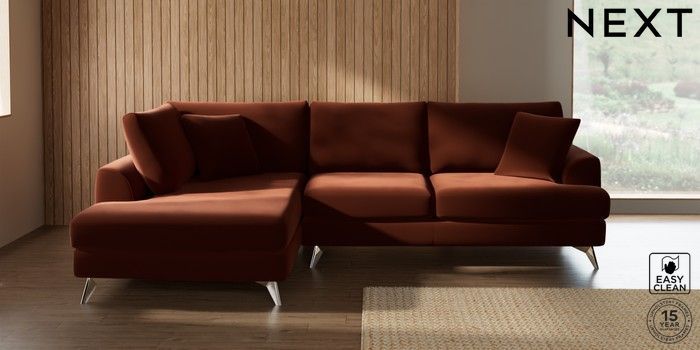 7.3.1 Buy Parker Medium Corner Chaise - Left Hand Plush Velvet Easy Clean Ginger Orange High Metal - Chrome from the Next UK online shop Click here to use our accessible website