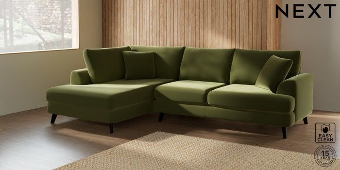 7.2.5 Buy Parker Medium Corner Chaise - Left Hand Plush Velvet Easy Clean Mid Olive Green Low Retro Tapered - Dark from the Next UK online shop Click here to use our accessible website