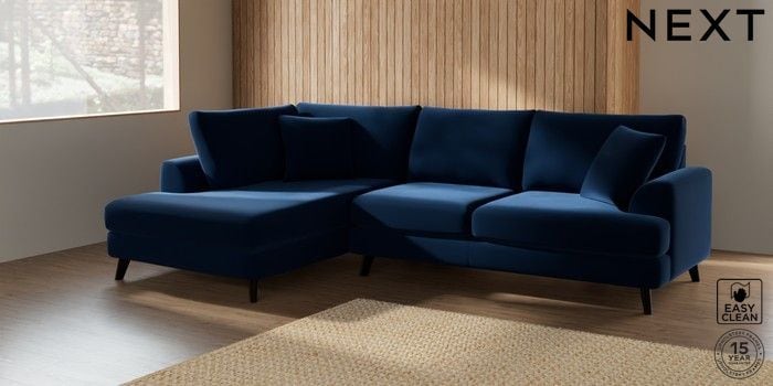 7.2.5 Buy Parker Medium Corner Chaise - Left Hand Plush Velvet Easy Clean Navy Blue Low Retro Tapered - Dark from the Next UK online shop Click here to use our accessible website