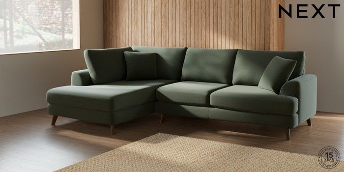 7.2.5 Buy Parker Medium Corner Chaise - Left Hand Relaxed Linen Look Dark Green Low Retro Tapered - Mid from the Next UK online shop Click here to use our accessible website