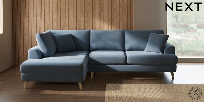 7.2.10 Buy Parker Medium Corner Chaise - Left Hand Relaxed Linen Look Mid Blue Low Retro Tapered - Light from the Next UK online shop Click here to use our accessible website