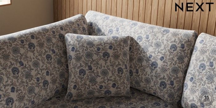 7.3.1 Buy Parker Medium Corner Chaise - Left Hand Relaxed Linen Look Print Woodblock Floral Blue High Metal - Black from the Next UK online shop Click here to use our accessible website