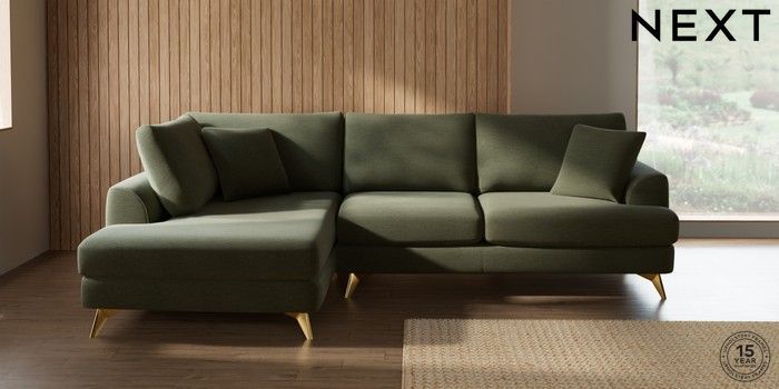 7.2.10 Buy Parker Medium Corner Chaise - Left Hand Ripple Chenille Mid Moss Green High Metal - Brass from the Next UK online shop Click here to use our accessible website