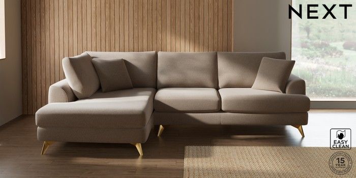 7.3.1 Buy Parker Medium Corner Chaise - Left Hand Tweedy Blend Easy Clean Light Dove Natural High Metal - Brass from the Next UK online shop Click here to use our accessible website