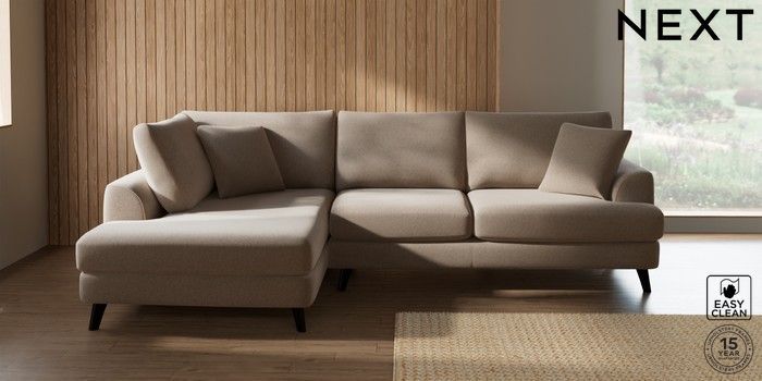 7.2.5 Buy Parker Medium Corner Chaise - Left Hand Tweedy Blend Easy Clean Light Dove Natural Low Retro Tapered - Dark from the Next UK online shop Click here to use our accessible website