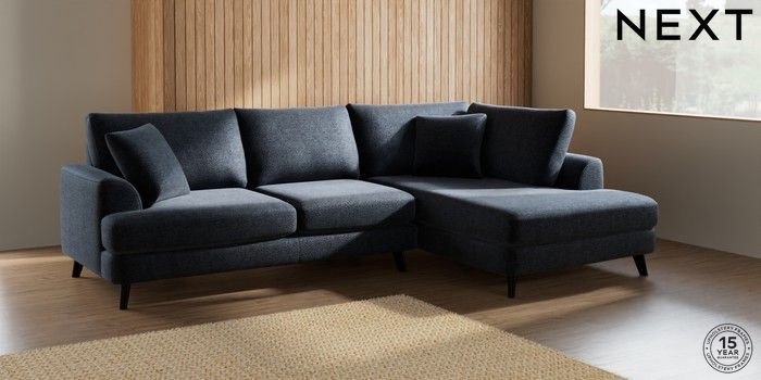 7.2.5 Buy Parker Medium Corner Chaise - Right Hand Boucle Chenille Dark Slate Blue Low Retro Tapered - Dark from the Next UK online shop Click here to use our accessible website
