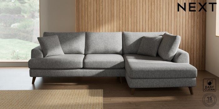 7.2.5 Buy Parker Medium Corner Chaise - Right Hand Chunky Boucle Easy Clean Light Grey Low Retro Tapered - Mid from the Next UK online shop Click here to use our accessible website