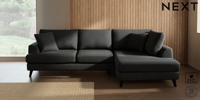 7.2.10 Buy Parker Medium Corner Chaise - Right Hand Tweedy Blend Easy Clean Charcoal Grey Low Retro Tapered - Dark from the Next UK online shop Click here to use our accessible website