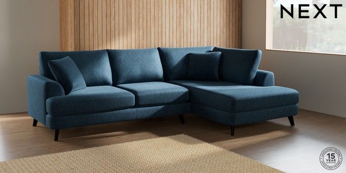 7.2.5 Buy Parker Medium Corner Chaise - Right Hand Cotswold Chenille Dark Blue Low Retro Tapered - Dark from the Next UK online shop Click here to use our accessible website
