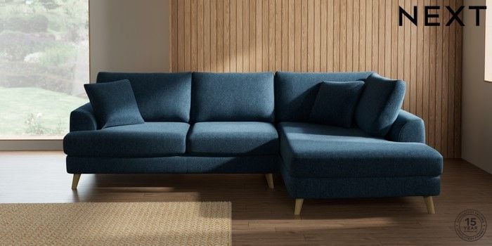 7.2.10 Buy Parker Medium Corner Chaise - Right Hand Cotswold Chenille Dark Blue Low Retro Tapered - Light from the Next UK online shop Click here to use our accessible website