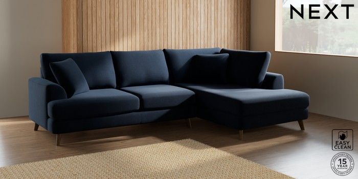7.2.5 Buy Parker Medium Corner Chaise - Right Hand Fine Chenille Easy Clean Dark Navy Blue Low Retro Tapered - Mid from the Next UK online shop Click here to use our accessible website
