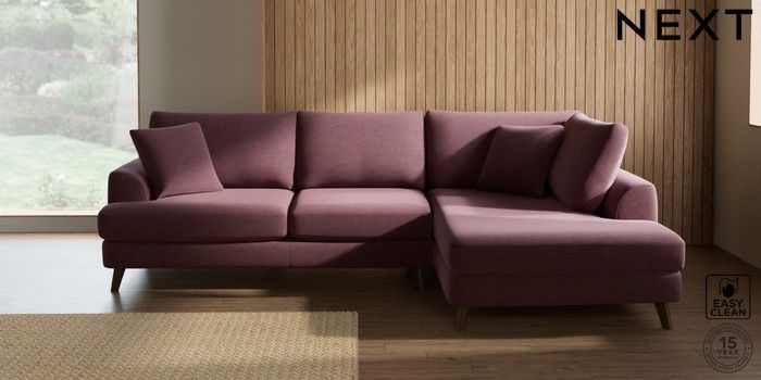 7.2.10 Buy Parker Medium Corner Chaise - Right Hand Fine Chenille Easy Clean Mid Mulberry Purple Low Retro Tapered - Mid from the Next UK online shop Click here to use our accessible website