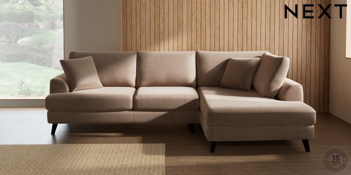7.2.10 Buy Parker Medium Corner Chaise - Right Hand Luxe Chenille Mid Natural Low Retro Tapered - Dark from the Next UK online shop Click here to use our accessible website