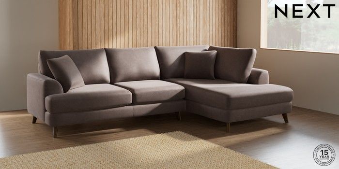 7.2.5 Buy Parker Medium Corner Chaise - Right Hand Luxe Chenille Mink Brown Low Retro Tapered - Mid from the Next UK online shop Click here to use our accessible website