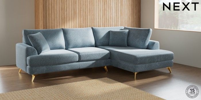 7.2.6 Buy Parker Medium Corner Chaise - Right Hand Plush Chenille Light Blue High Metal - Brass from the Next UK online shop Click here to use our accessible website
