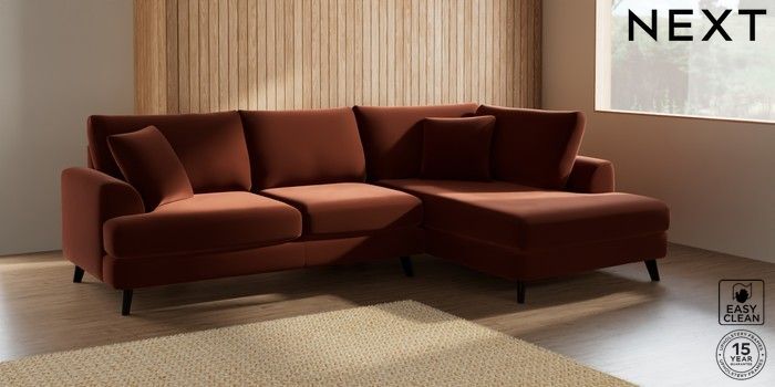 7.2.5 Buy Parker Medium Corner Chaise - Right Hand Plush Velvet Easy Clean Ginger Orange Low Retro Tapered - Dark from the Next UK online shop Click here to use our accessible website