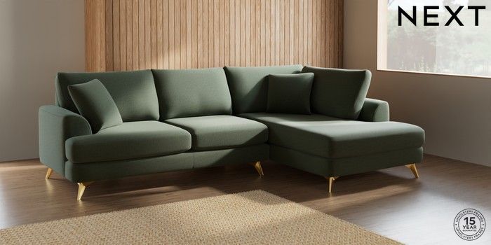7.2.5 Buy Parker Medium Corner Chaise - Right Hand Relaxed Linen Look Dark Green High Metal - Brass from the Next UK online shop Click here to use our accessible website