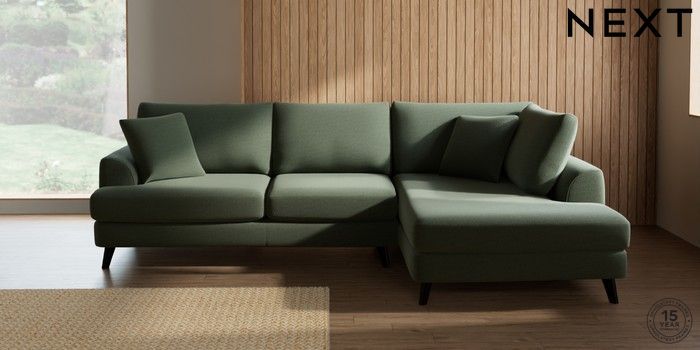 7.3.1 Buy Parker Medium Corner Chaise - Right Hand Relaxed Linen Look Dark Green Low Retro Tapered - Dark from the Next UK online shop Click here to use our accessible website