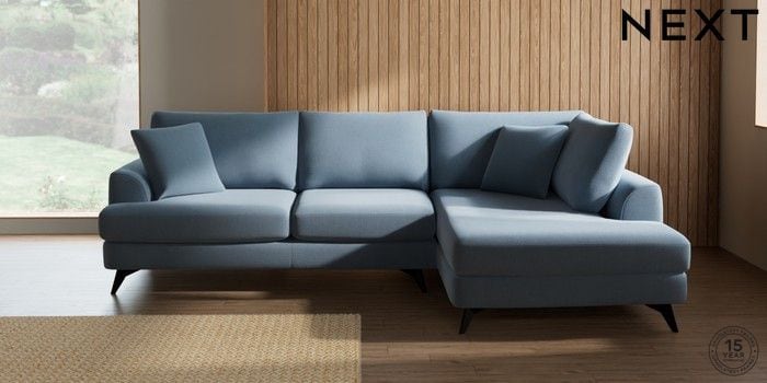 7.2.10 Buy Parker Medium Corner Chaise - Right Hand Relaxed Linen Look Mid Blue High Metal - Black from the Next UK online shop Click here to use our accessible website