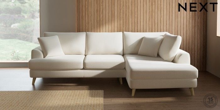 7.2.10 Buy Parker Medium Corner Chaise - Right Hand Ripple Chenille Oyster Low Retro Tapered - Light from the Next UK online shop Click here to use our accessible website