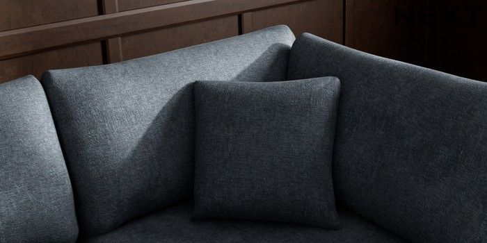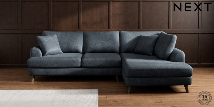 7.2.10 Buy Parker Medium Corner Chaise - Right Hand Plush Chenille Slate Blue Low Retro Tapered - Mid from the Next UK online shop Click here to use our accessible website
