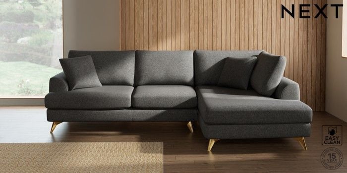 7.3.1 Buy Parker Medium Corner Chaise - Right Hand Tweedy Blend Easy Clean Dark Grey High Metal - Brass from the Next UK online shop Click here to use our accessible website