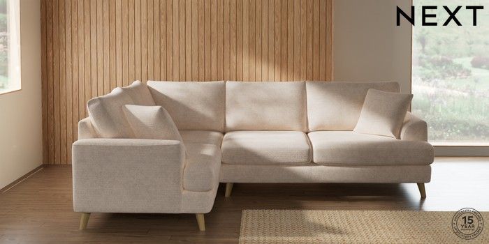 7.2.10 Buy Parker Medium Corner Sofa - Left Hand Boucle Chenille Oyster Low Retro Tapered - Light from the Next UK online shop Click here to use our accessible website