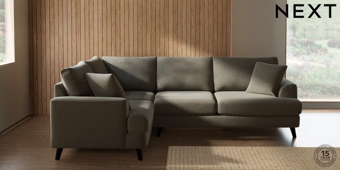 7.2.10 Buy Parker Medium Corner Sofa - Left Hand Chunky Marl Light Olive Green Low Retro Tapered - Dark from the Next UK online shop Click here to use our accessible website