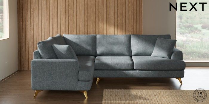 7.2.10 Buy Parker Medium Corner Sofa - Left Hand Chunky Weave Mid Blue High Metal - Brass from the Next UK online shop Click here to use our accessible website