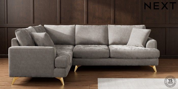 7.2.10 Buy Parker Medium Corner Sofa - Left Hand Distressed Velour French Grey High Metal - Brass from the Next UK online shop Click here to use our accessible website