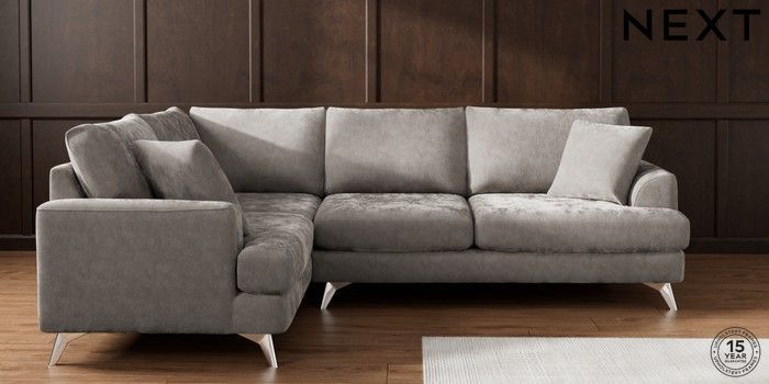 7.2.10 Buy Parker Medium Corner Sofa - Left Hand Distressed Velour French Grey High Metal - Chrome from the Next UK online shop Click here to use our accessible website