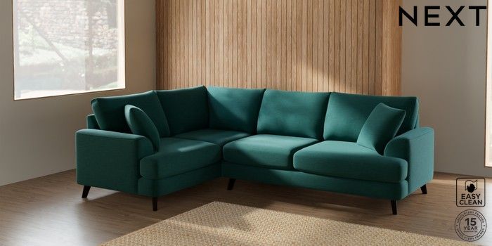 7.2.5 Buy Parker Medium Corner Sofa - Left Hand Fine Chenille Easy Clean Dark Juniper Green Low Retro Tapered - Dark from the Next UK online shop Click here to use our accessible website