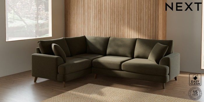 7.2.5 Buy Parker Medium Corner Sofa - Left Hand Fine Chenille Easy Clean Dark Moss Green Low Retro Tapered - Mid from the Next UK online shop Click here to use our accessible website