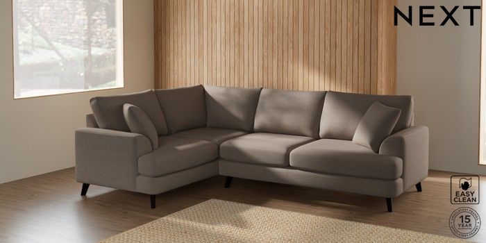 7.2.5 Buy Parker Medium Corner Sofa - Left Hand Fine Chenille Easy Clean Mid Taupe Brown Low Retro Tapered - Dark from the Next UK online shop Click here to use our accessible website