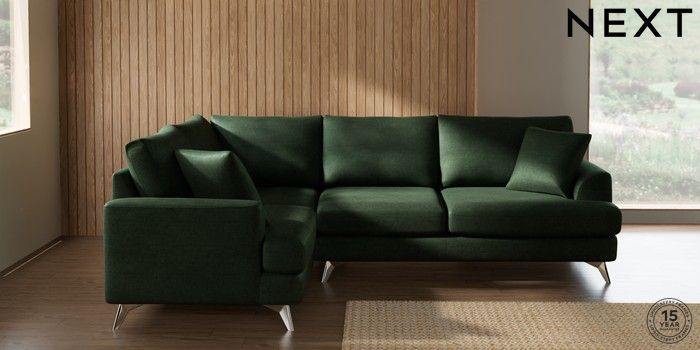 7.2.10 Buy Parker Medium Corner Sofa - Left Hand Luxe Chenille Dark Green High Metal - Chrome from the Next UK online shop Click here to use our accessible website