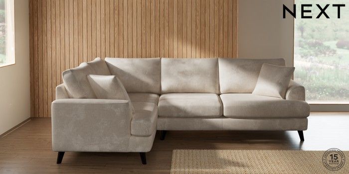 7.2.10 Buy Parker Medium Corner Sofa - Left Hand Plush Chenille Oyster Low Retro Tapered - Dark from the Next UK online shop Click here to use our accessible website