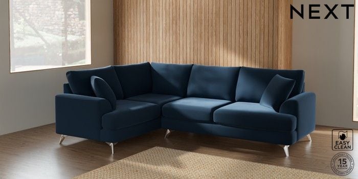 7.2.5 Buy Parker Medium Corner Sofa - Left Hand Plush Velvet Easy Clean Airforce Blue High Metal - Chrome from the Next UK online shop Click here to use our accessible website