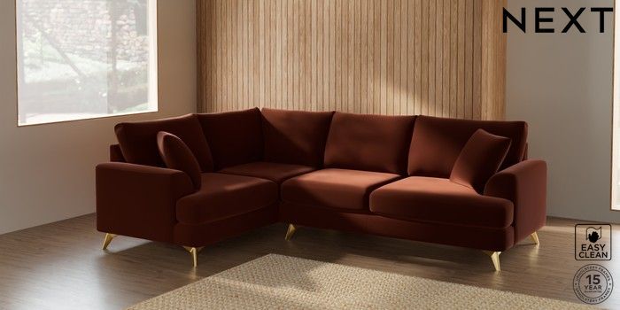7.2.5 Buy Parker Medium Corner Sofa - Left Hand Plush Velvet Easy Clean Ginger Orange High Metal - Brass from the Next UK online shop Click here to use our accessible website