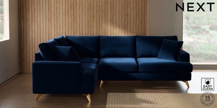 7.2.10 Buy Parker Medium Corner Sofa - Left Hand Plush Velvet Easy Clean Navy Blue High Metal - Brass from the Next UK online shop Click here to use our accessible website