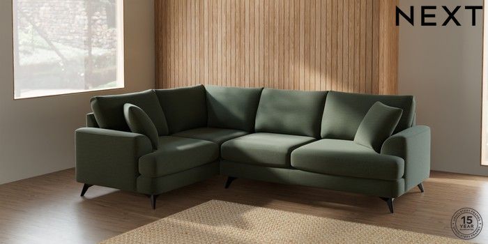 7.2.5 Buy Parker Medium Corner Sofa - Left Hand Relaxed Linen Look Dark Green High Metal - Black from the Next UK online shop Click here to use our accessible website