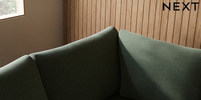 7.2.10 Buy Parker Medium Corner Sofa - Left Hand Relaxed Linen Look Dark Green Low Retro Tapered - Mid from the Next UK online shop Click here to use our accessible website