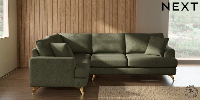 7.2.10 Buy Parker Medium Corner Sofa - Left Hand Tweedy Chenille Mid Moss Green High Metal - Brass from the Next UK online shop Click here to use our accessible website