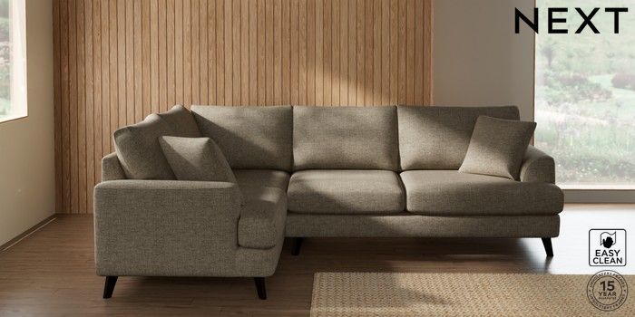 7.2.10 Buy Parker Medium Corner Sofa - Left Hand Woven Chenille Easy Clean Mid Natural Low Retro Tapered - Dark from the Next UK online shop Click here to use our accessible website