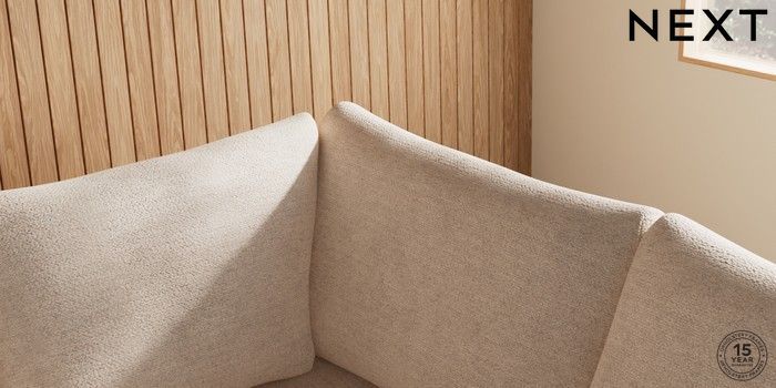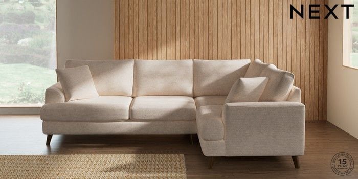 7.2.10 Buy Parker Medium Corner Sofa - Right Hand Boucle Chenille Oyster Low Retro Tapered - Mid from the Next UK online shop Click here to use our accessible website