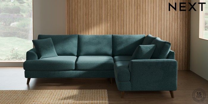 7.2.10 Buy Parker Medium Corner Sofa - Right Hand Chunky Chenille Mid Teal Green Low Retro Tapered - Mid from the Next UK online shop Click here to use our accessible website