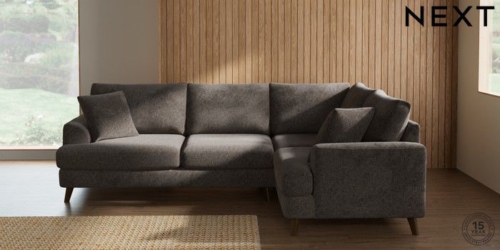 7.2.4 Buy Parker Medium Corner Sofa - Right Hand Chunky Chenille Mink Brown Low Retro Tapered - Mid from the Next UK online shop Click here to use our accessible website